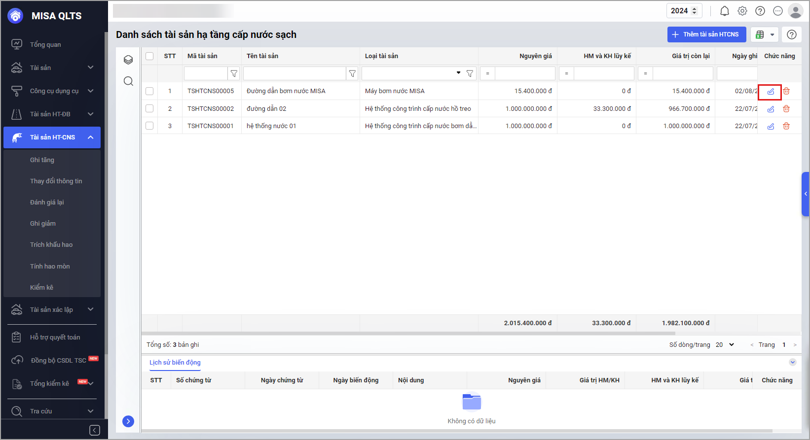 - Trong quá trình sử dụng tài sản, nếu muốn sửa thông tin tài sản, anh/chị chọn biểu tượng cây bút.