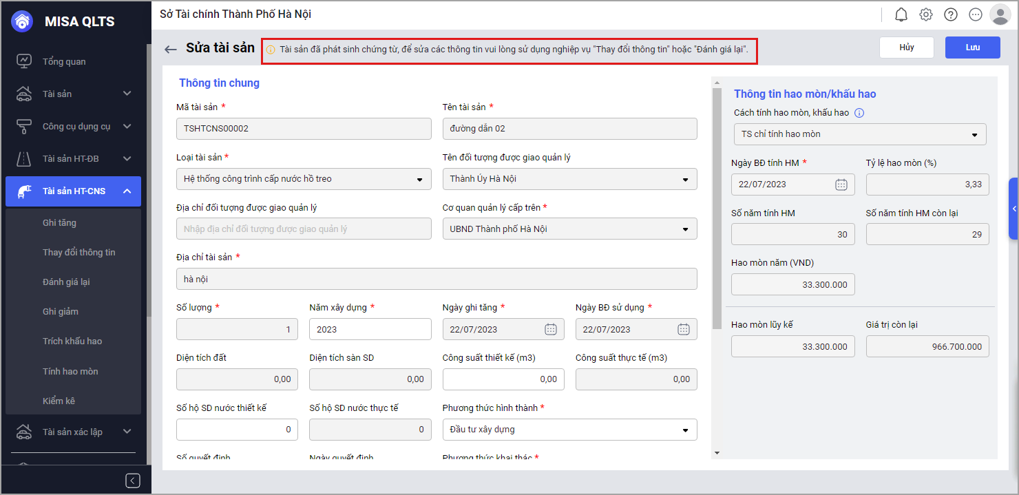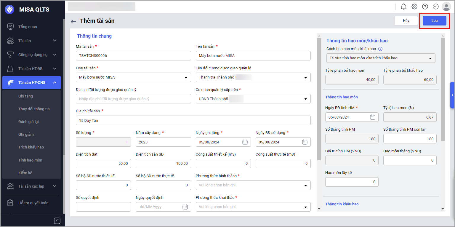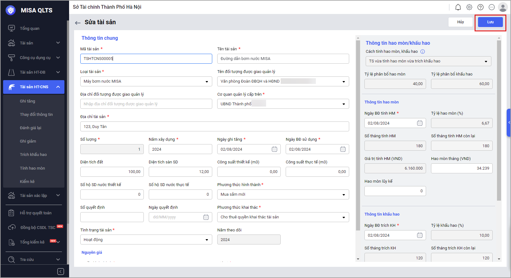 - Anh/chị sửa thông tin tài sản, sau đó chọn Lưu để lưu thông tin.