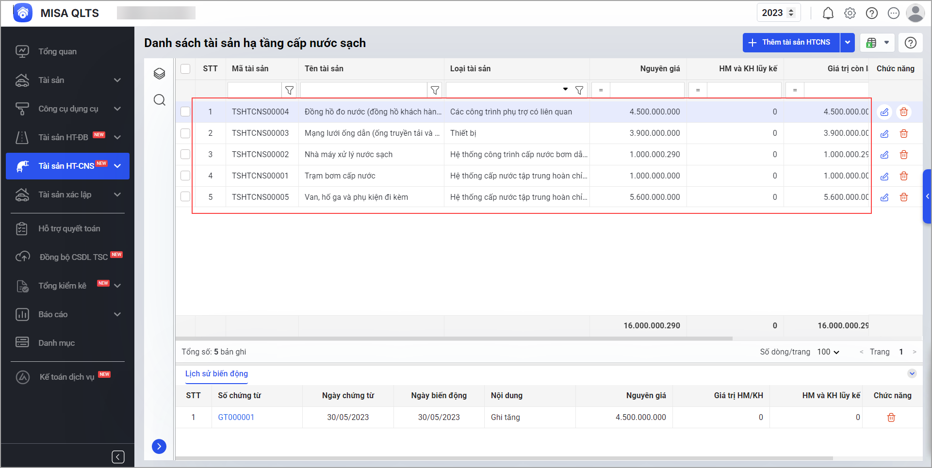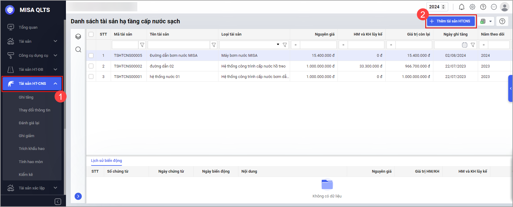 Bước 1. Tại menu chọn Tài sản HT – CNS\Thêm tài sản HT – CNS để khai báo thông tin tài sản kết cấu hạ tầng cấp nước sạch.
