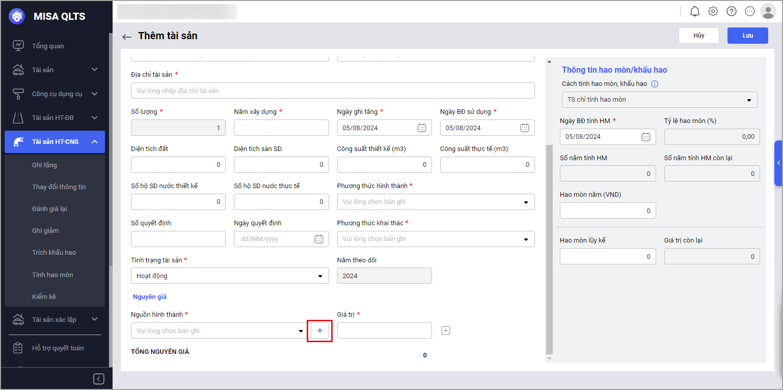 Lưu ý: 1 tài sản có thể có nhiều Nguồn hình thành và tiện ích có thể thêm nhanh Nguồn hình thành trên giao diện, anh/chị chọn biểu tượng dấu cộng để thêm Nguồn hình thành.