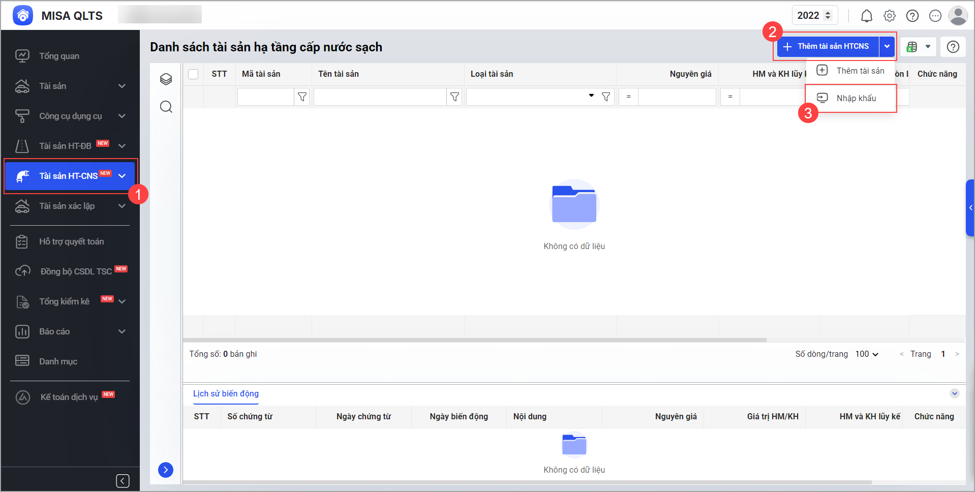 Tại menu Tài sản HT-CNS, nhấn Thêm tài sản HT-CNS, chọn Nhập khẩu.