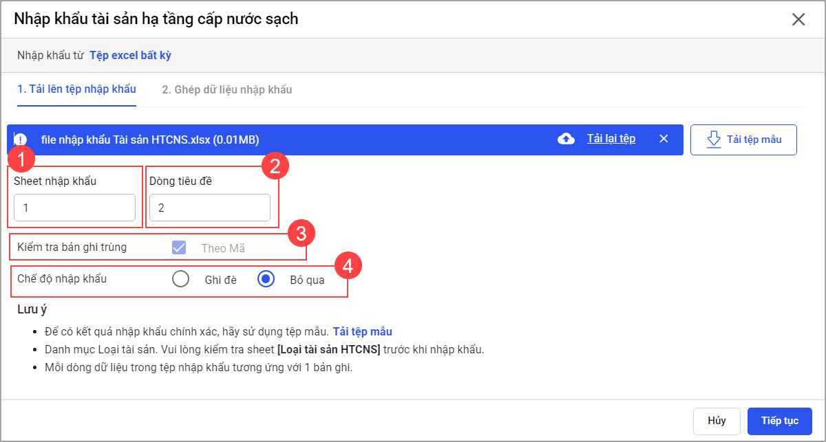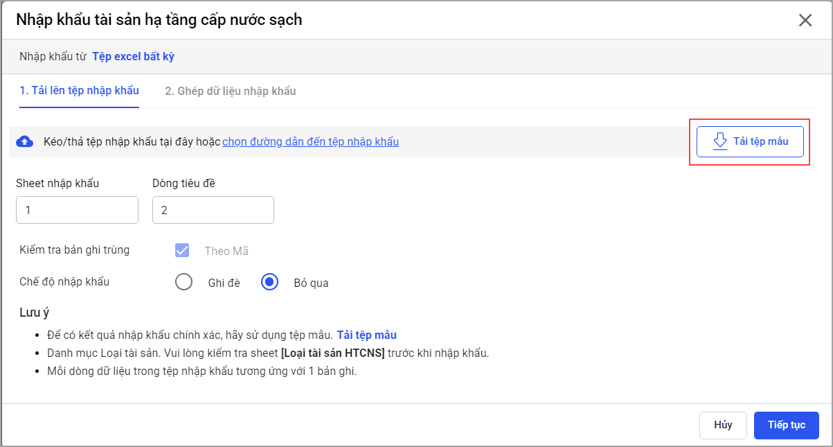Để có kết quả nhập khẩu chính xác, anh/chị nhấn Tải tệp mẫu và khai báo các trường thông tin theo tệp mẫu đã tải.