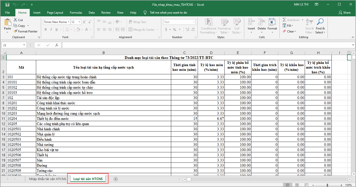 - Danh mục Loại tài sản theo Thông tư 73/2022/TT-BTC. anh chị vui lòng kiểm tra sheet Loại tài sản trước khi nhập khẩu.