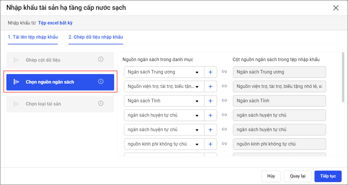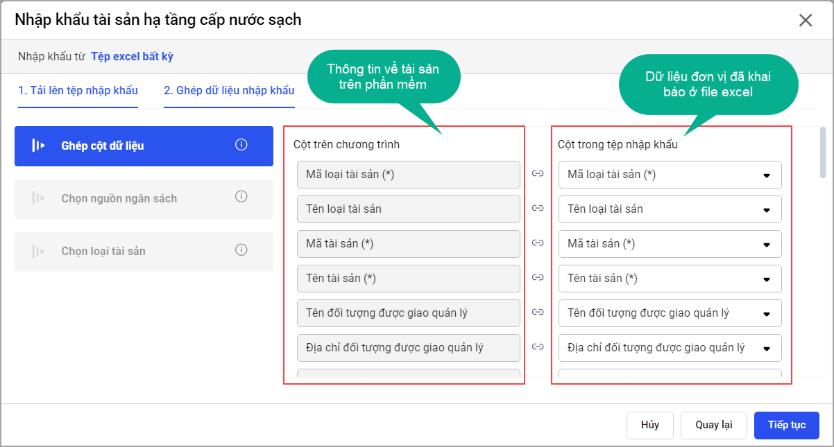 – Phần Ghép cột dữ liệu cho phép anh/chị tự thực hiện ghép các cột dữ liệu trên file excel tương ứng với các thông tin của tài sản trên phần mềm.