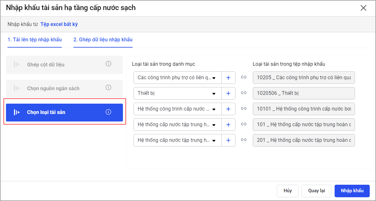 – Phần Chọn loại tài sản cho phép ghép loại tài sản được khai báo trên tệp nhập khẩu tương ứng với loại tài sản trong danh mục trên phần mềm.