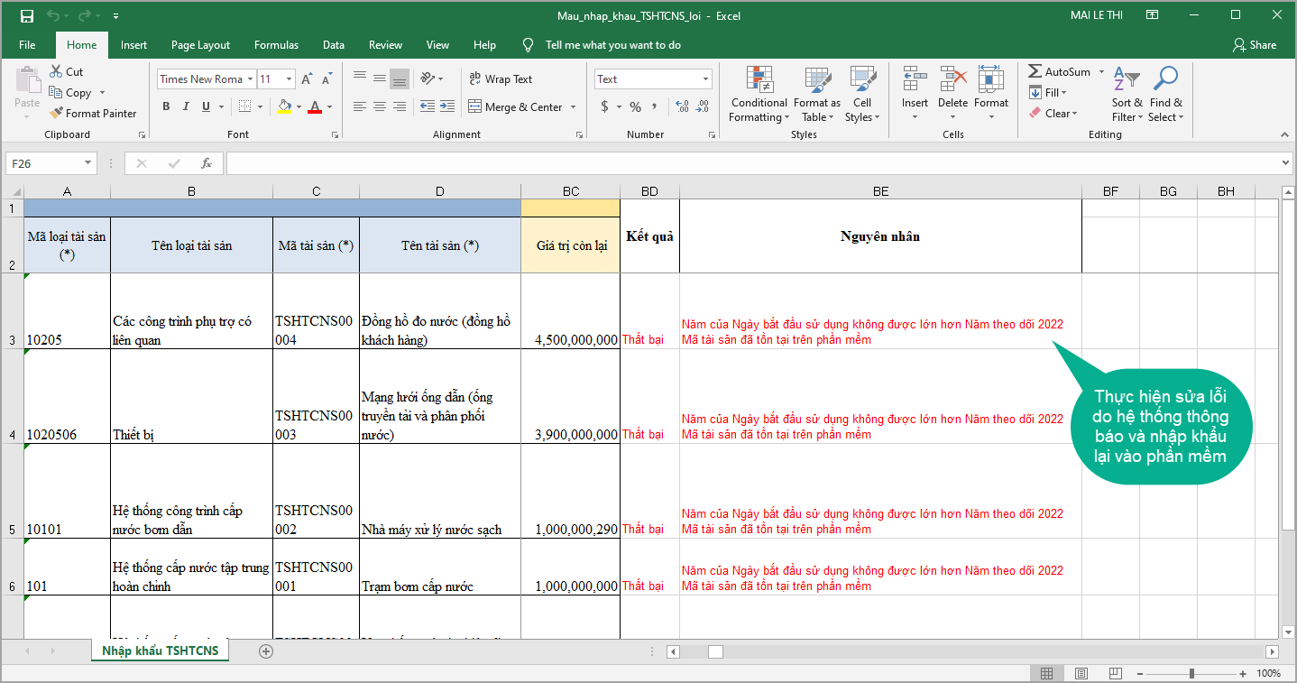 - Trường hợp 2: Có bản ghi không nhập khẩu được: phần mềm cũng sẽ hiển thị thông báo. Anh/chị nhấn Tải danh sách lỗi, phần mềm sẽ thông báo nguyên nhân ở cột cuối trong danh sách => thực hiện sửa các bản ghi bị lỗi và nhập khẩu lại vào phần mềm.