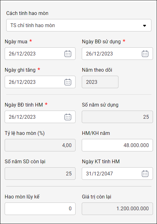 • Ngày kết thúc tính hao mòn: Là ngày 31/12 của năm (Năm theo dõi + Số năm sử dụng còn lại – 1).