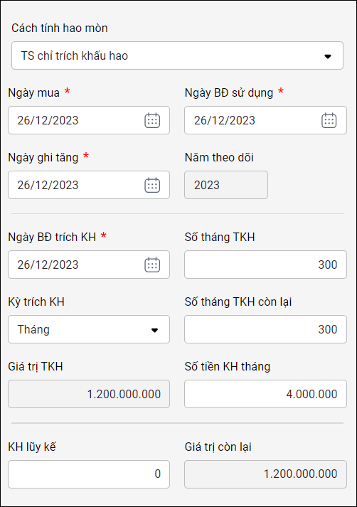 • Khấu hao lũy kế: Với tài sản mới (=0); Với tài sản cũ (= Khấu hao kỳ x Số kỳ tròn + Khấu hao kỳ đầu tiên)