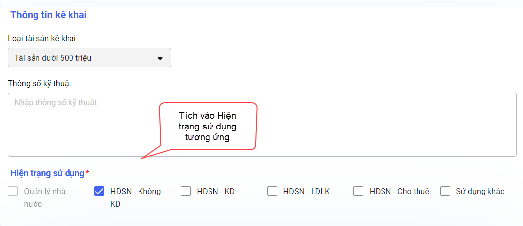 – Đối với đơn vị quản lý hành chính: Chỉ được nhập hiện trạng là Quản lý nhà nước, sử dụng khác.