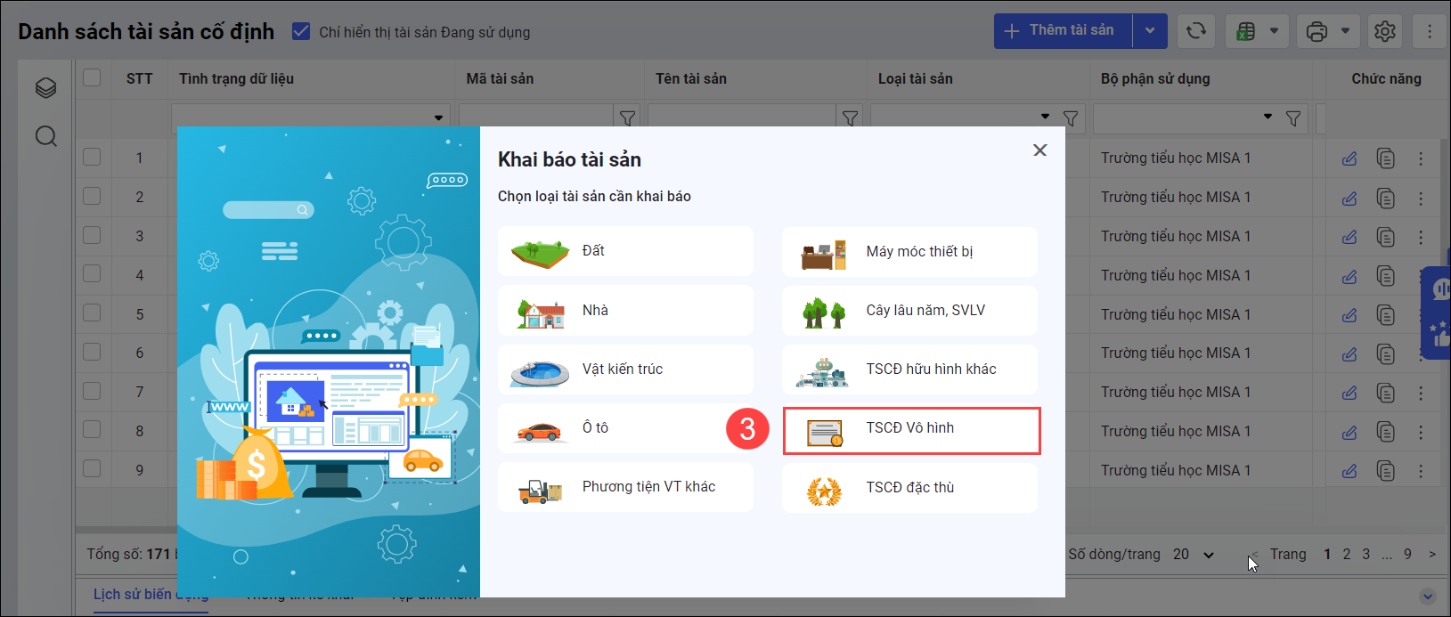 Nội dung bài viết gồm: Các bước khai báo TSCĐ vô hình, bao gồm: lựa chọn loại tài sản, nhập thông tin chi tiết (nguyên giá, bộ phận sử dụng, nguồn hình thành…), khai báo hiện trạng sử dụng, thông tin khấu hao/hao mòn phù hợp với từng loại hình