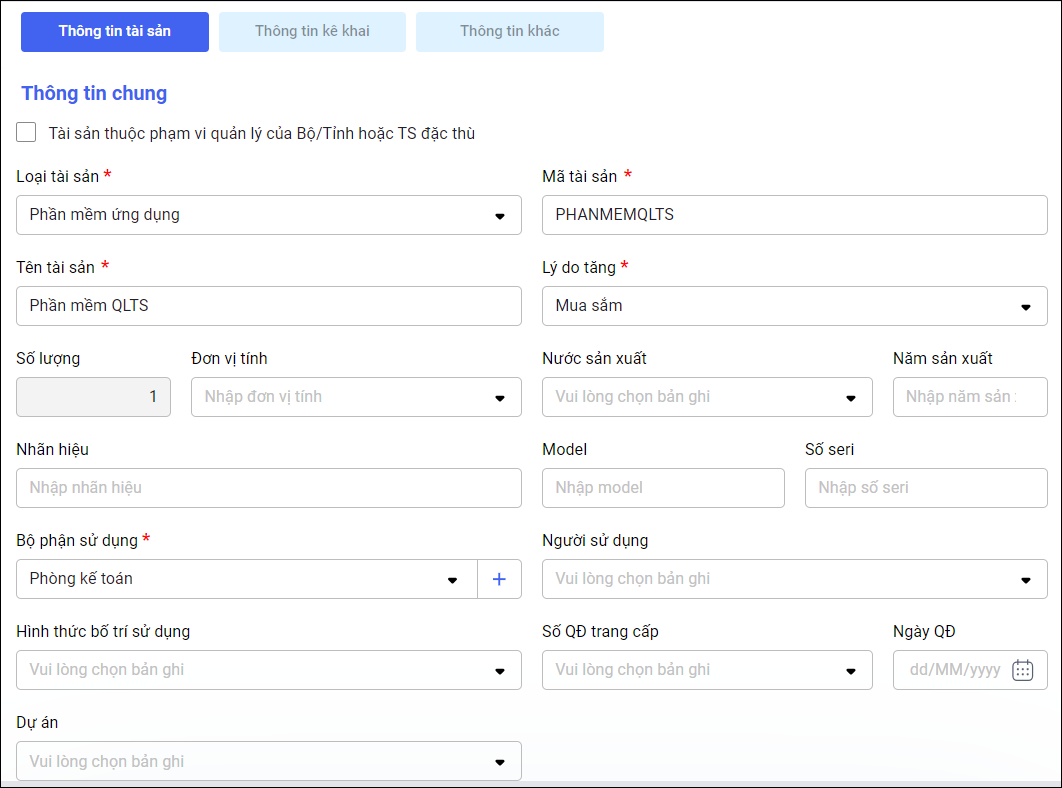 • Tên tài sản: Nhập theo nhu cầu quản lý của đơn vị