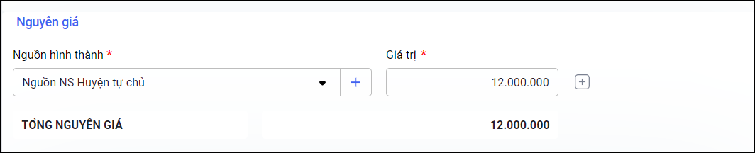 • Nguồn hình thành: Khai báo Nguồn hình thành tài sản.  Nhập Giá trị nhận được từ mỗi nguồn tương ứng.