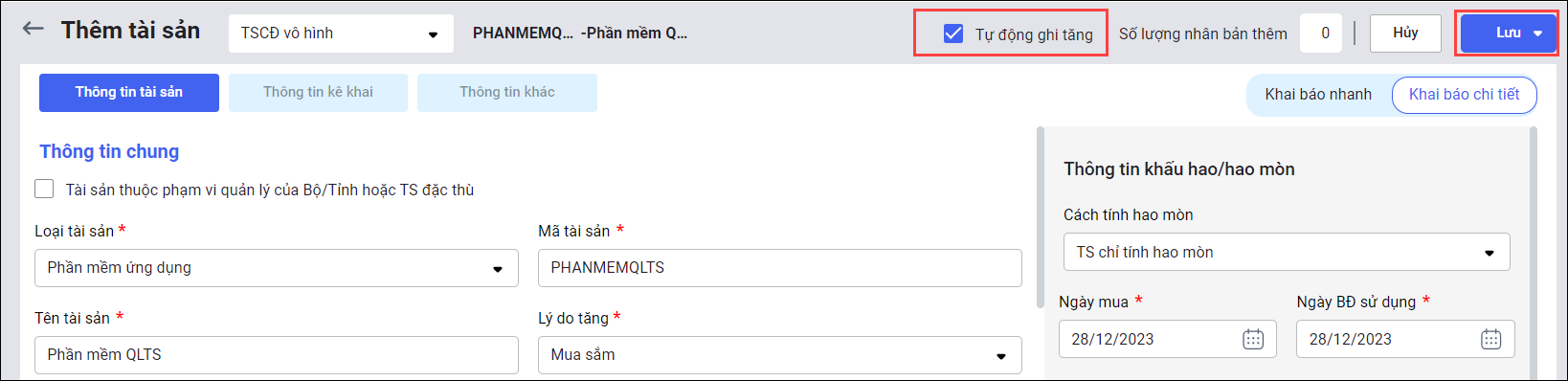 • Sau khi khai báo xong các thông tin tài sản, nếu muốn ghi tăng tài sản luôn thì tích chọn Tự động ghi tăng.