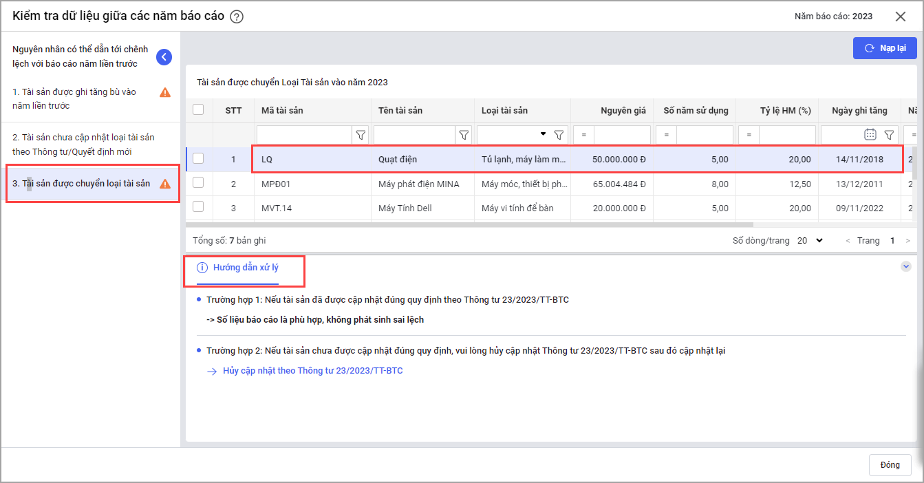 • Phần mềm chỉ ra lỗi sai lệch dữ liệu báo cáo do Tài sản được chuyển loại tài sản.