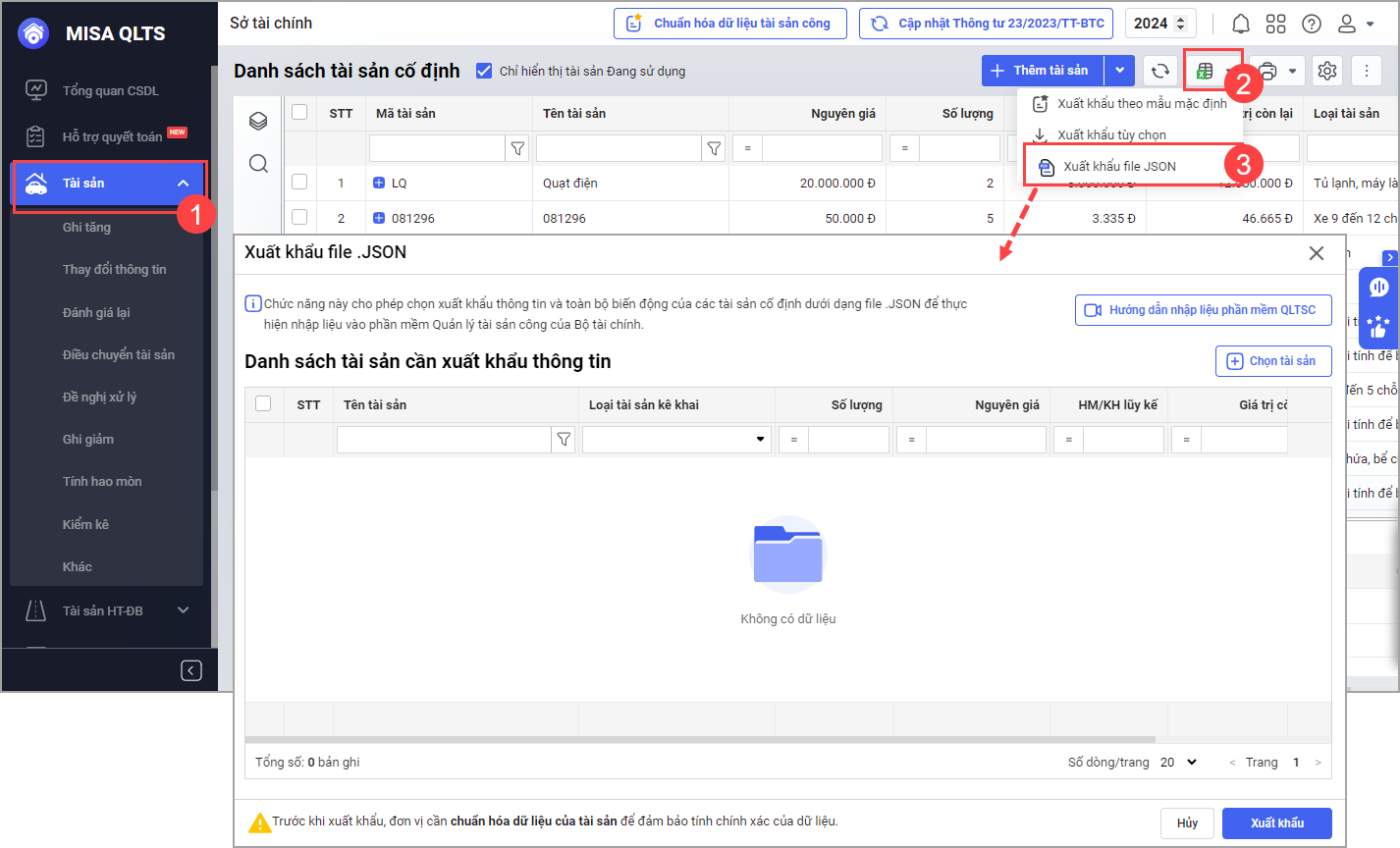 - Tại Tài sản\Danh sách tài sản cố định\Xuất khẩu\Xuất khẩu file .JSON: