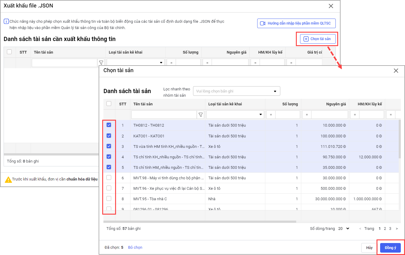 - Chọn tài sản để chọn tài sản cần xuất khẩu/tích chọn tài sản sau đó nhấn Đồng ý.