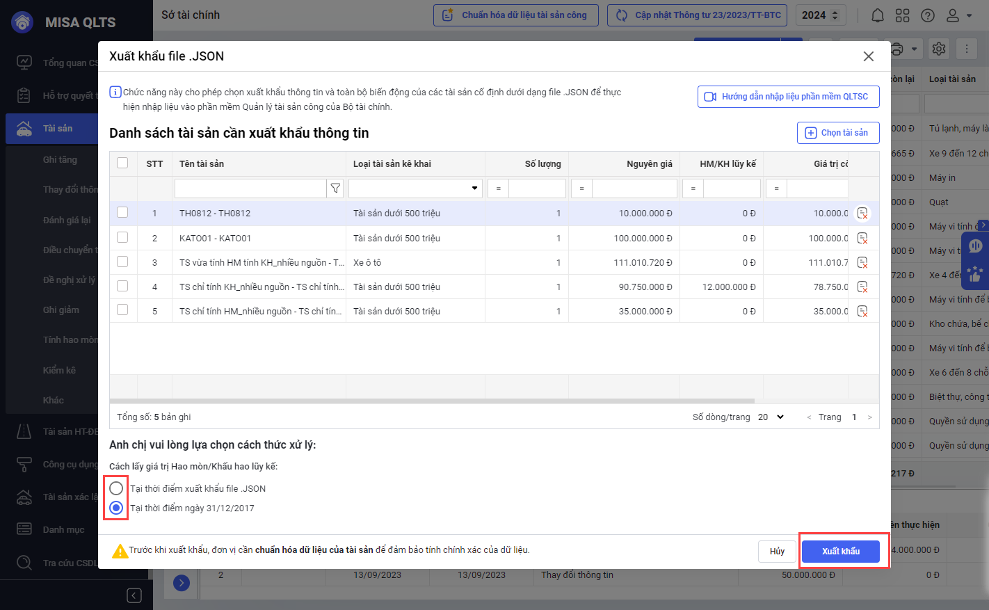 - Chọn Tại thời điểm xuất khẩu file.JSON phần mềm sẽ lấy lên thông tin Hao mòn/Khấu hao tại thời điểm xuất khẩu tức là lấy lên thông tin mới nhất của tài sản. Ở ví dụ trên nếu thời điểm xuất khẩu file.JSON là 2023 thì thông tin hao mòn của tài sản sẽ là 30 triệu đồng (thời điểm xuất khẩu file.JSON)