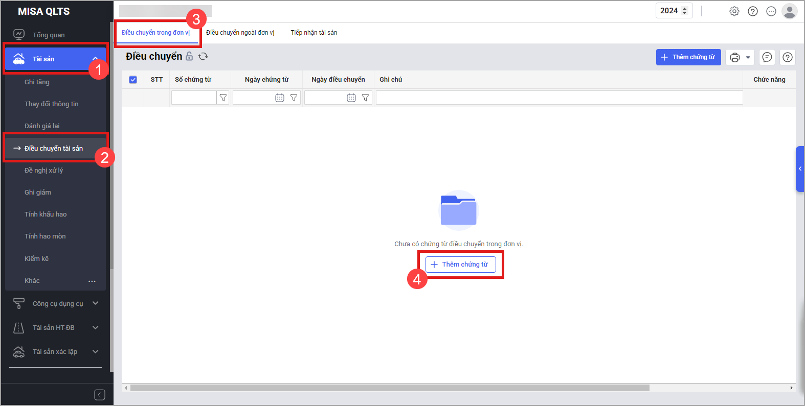 Tại menu Tài sản\Điều chuyển\Điều chuyển trong đơn vị\Thêm chứng từ: