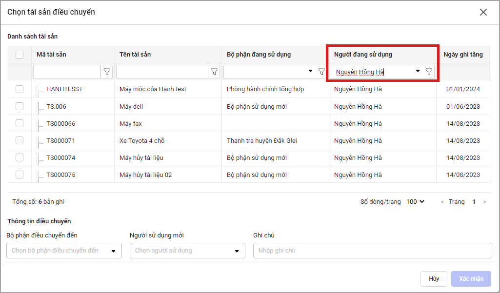 - Khi chọn tài sản để điều chuyển, phần mềm bổ sung chức năng lọc theo cột Người đang sử dụng.