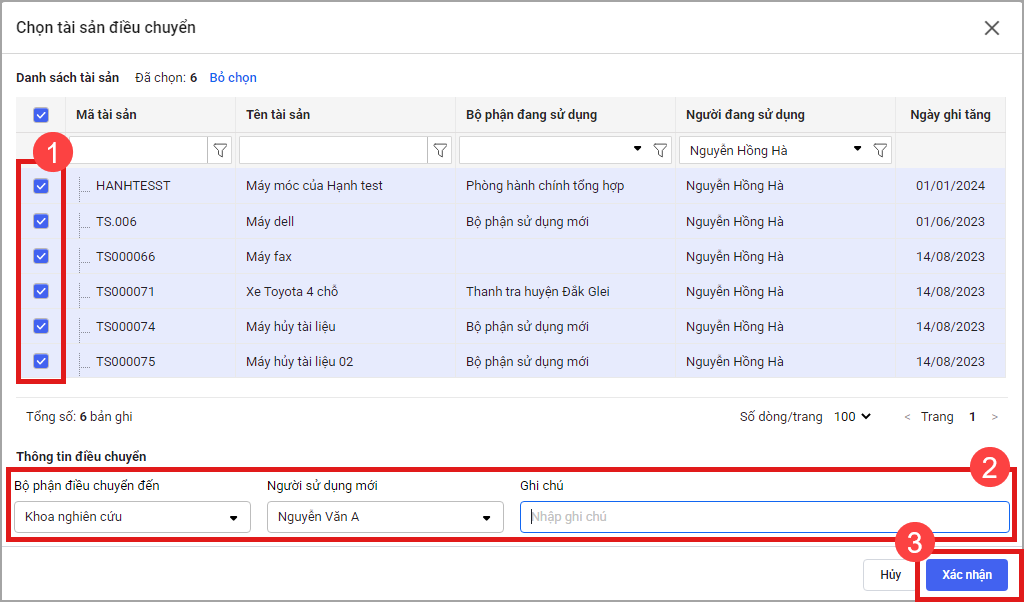 - Tích chọn tài sản cần điều chuyển, sau đó chọn Bộ phận nhận điều chuyển và Người sử dụng mới, rồi bấm Xác nhận.