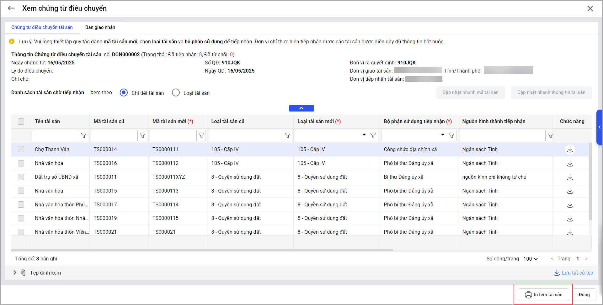 Phạm vi in tem tài sản: Xác định danh sách các tài sản cần in tem (ví dụ: toàn bộ tài sản vừa tiếp nhận, hoặc chỉ một số tài sản cụ thể).