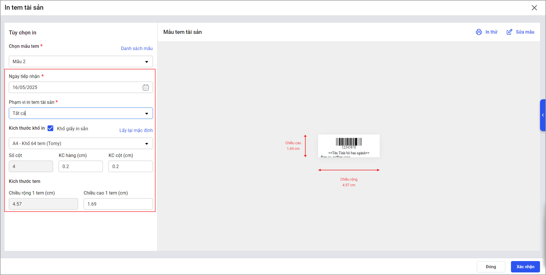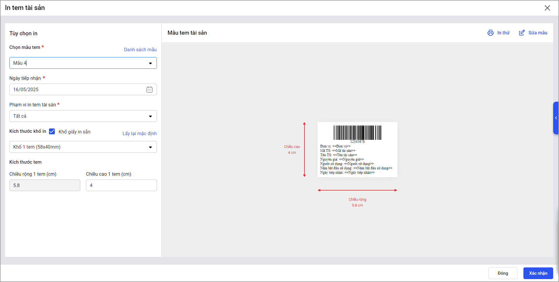 - Sau khi thiết lập xong, chọn In để in tem tài sản, hoặc Lưu mẫu để lưu thiết lập