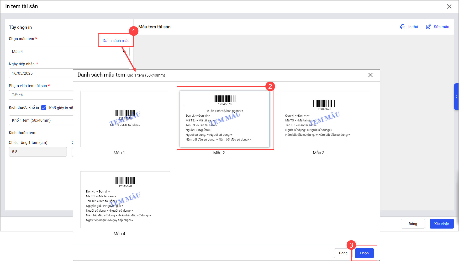Bước 2: Thiết lập mẫu sau đó tiến hành in tem tài sản