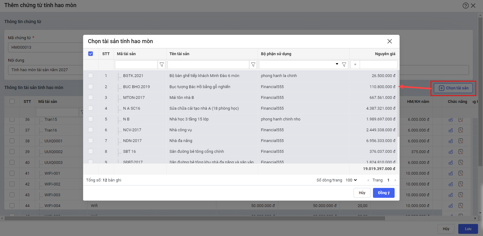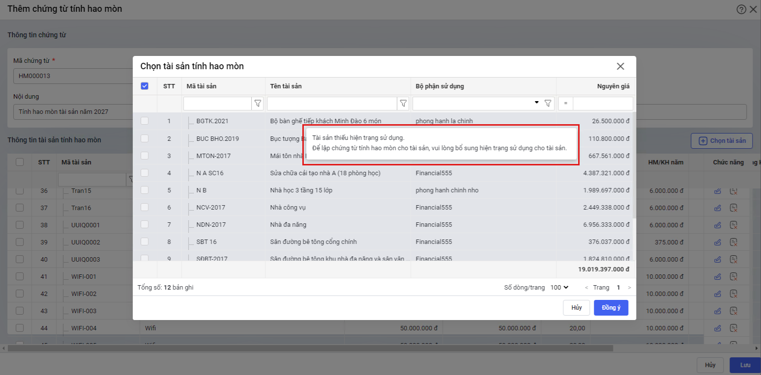 - Khi phát hiện thiếu tài sản trên chứng từ tính hao mòn, cán bộ QLTS Chọn tài sản phần mềm sẽ hiển thị các tài sản không đủ điều kiện để tính hao mòn