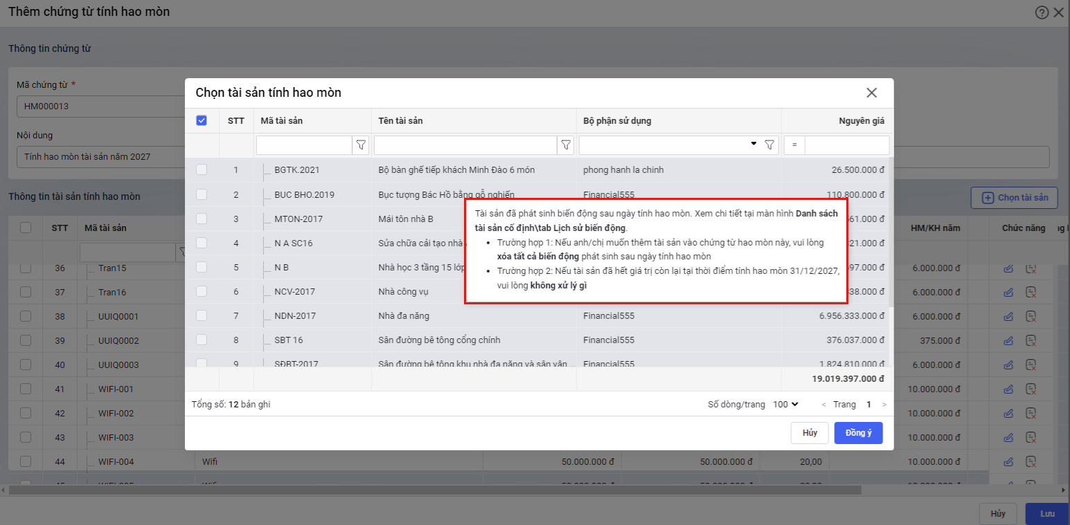 - Trường hợp có tài sản không hiển thị trong danh sách tài sản trên chứng từ, phần mềm có hiển thị cảnh báo