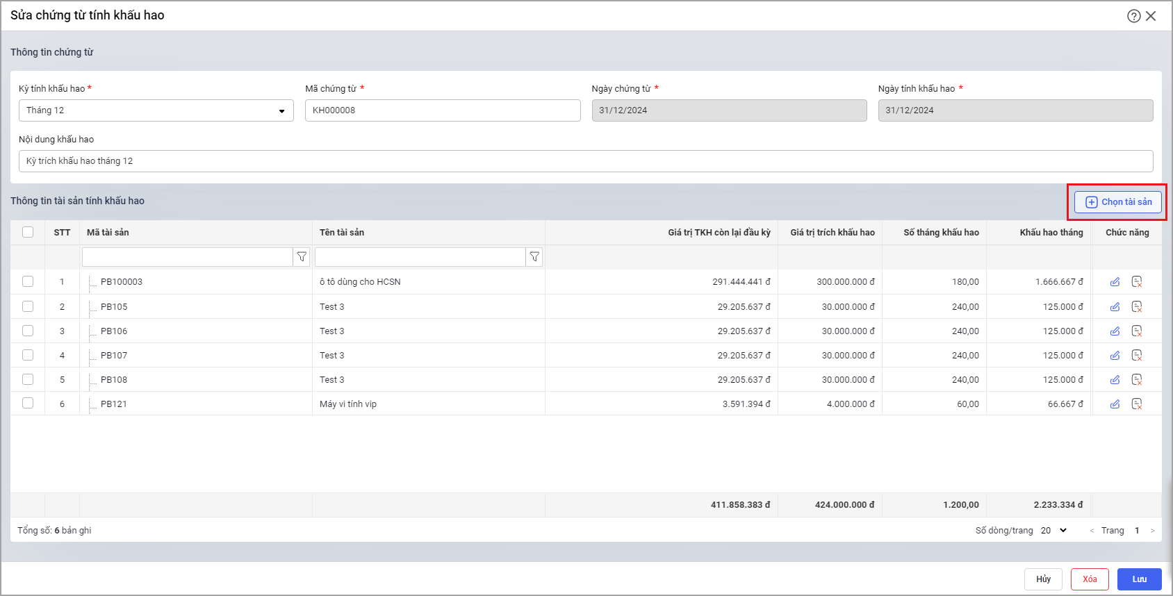 - Tại menu Tính hao mòn\Thêm chứng từ hoặc Sửa chứng từ: