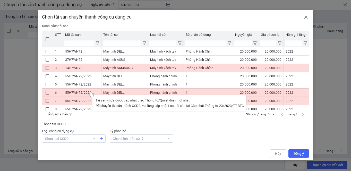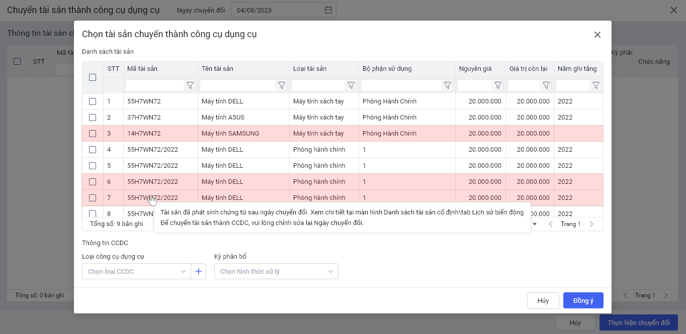 2. Khi thực hiện chuyển tài sản thành CCDC, Cán bộ IGov Tài sản mong muốn nắm bắt nguyên nhân danh sách tài sản không hiển thị đầy đủ tài sản để biết hướng xử lý kịp thời