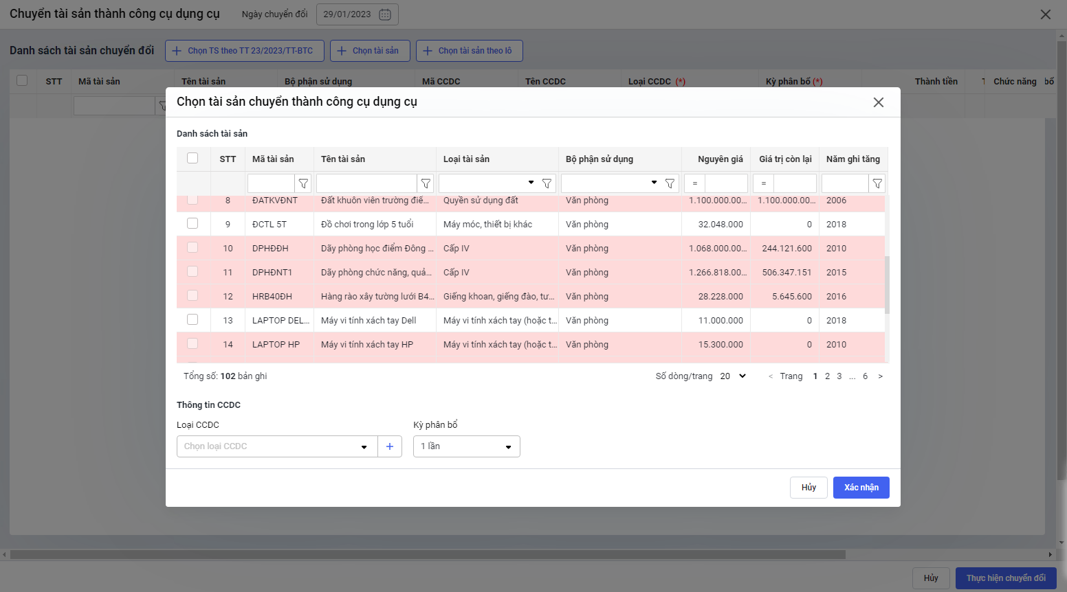 Tại Tài sản\Chuyển thành CCDC\Chọn tài sản: Phần mềm sẽ lấy lên danh sách tất cả tài sản có trạng thái Chưa ghi tăngĐang sử dụng trước ngày chuyển đổi.