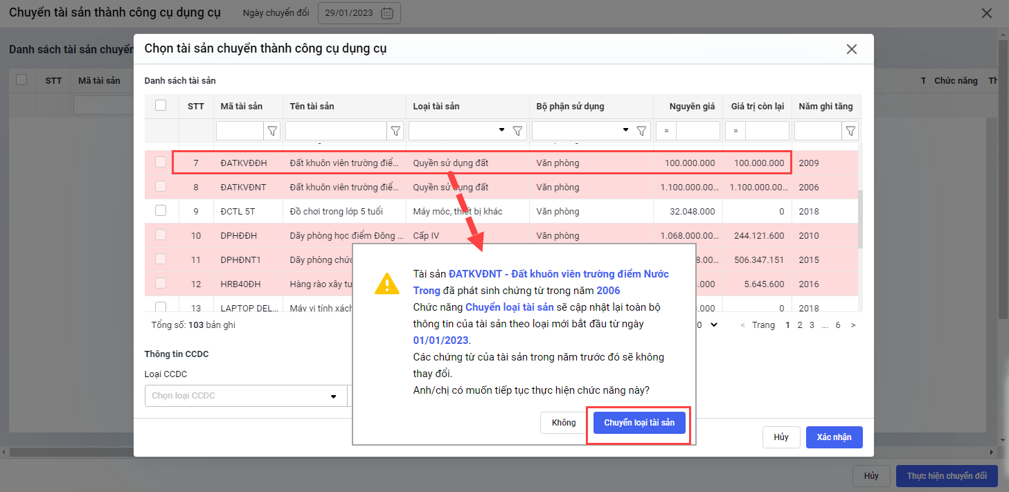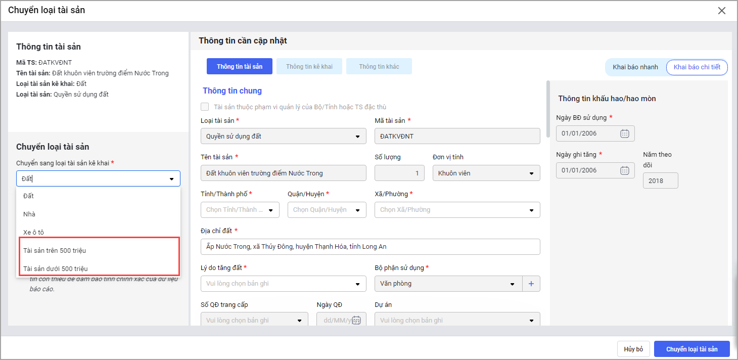 • Để chuyển tài sản thành CCDC, anh/chị cần chuyển loại tài sản kê khai sản kê khai sang Tài sản trên 500 triệu hoặc Tài sản dưới 500 triệu, chọn Chuyển loại tài sản để chắc chắn muốn chuyển loại tài sản.