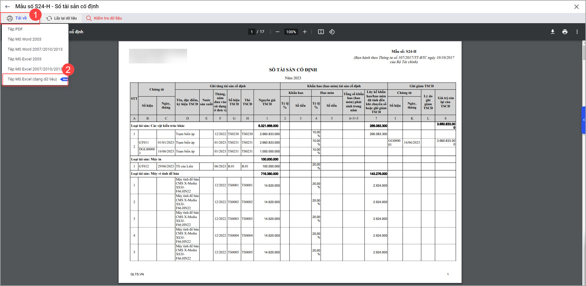 Ví dụ: Khi in mẫu số S24-H: Sổ tài sản cố định, báo cáo này có thể xuất tệp MS Excel (dạng dữ liệu).