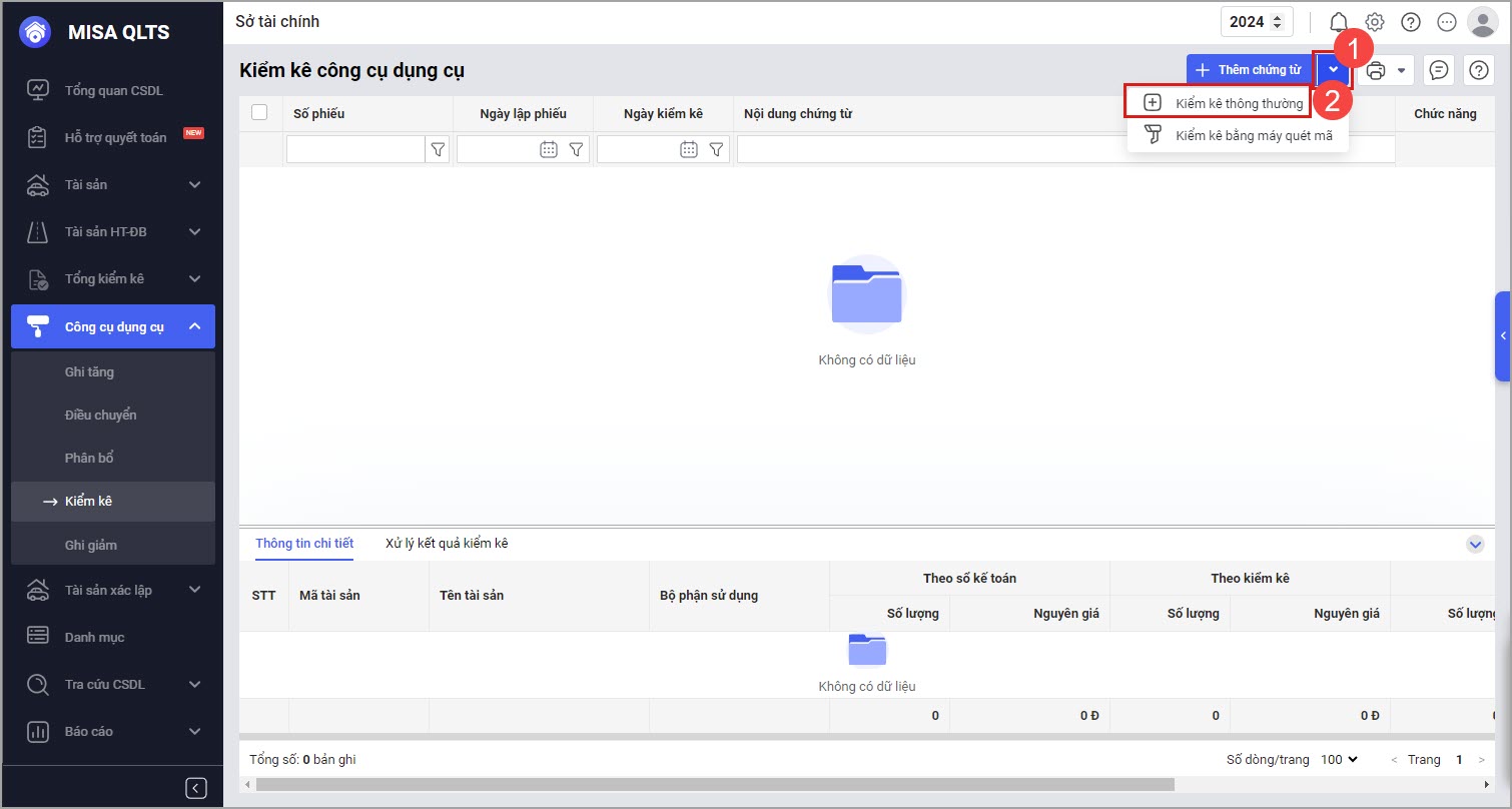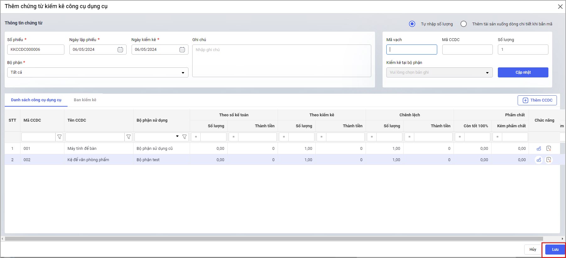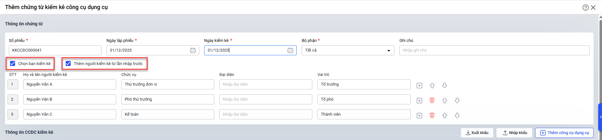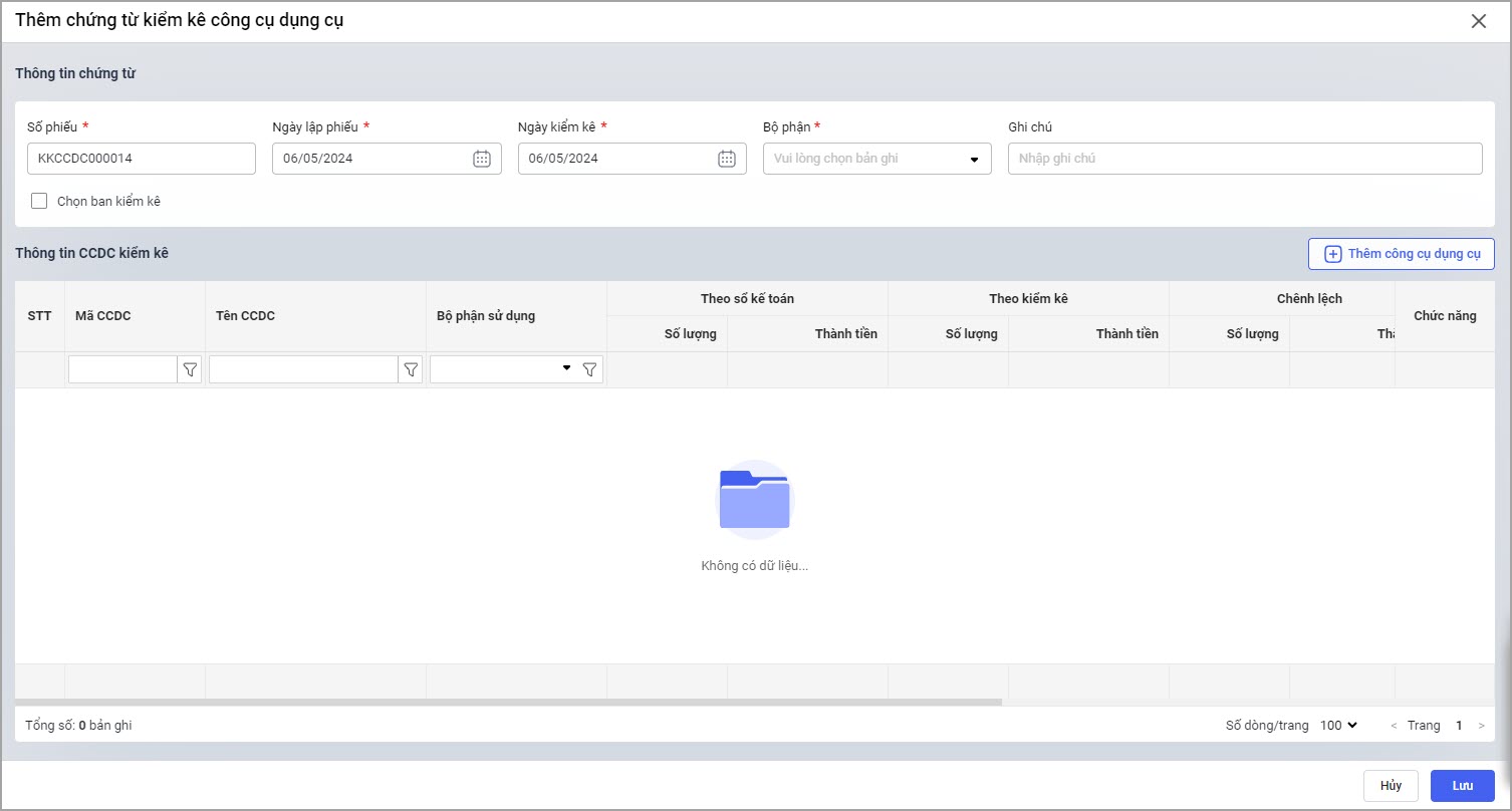 Bước 2: Nhập thông tin chứng từ kiểm kê CCDC
