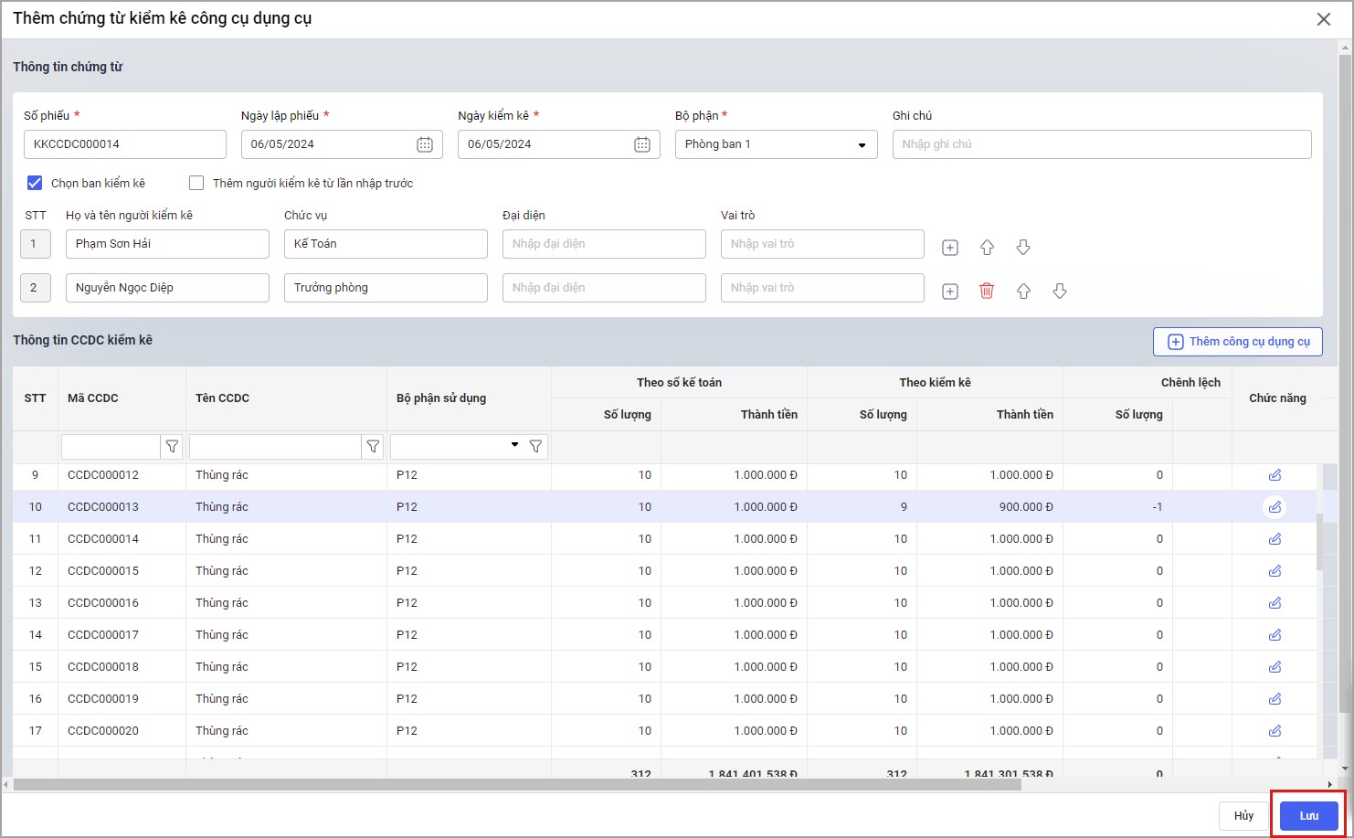 • Sau khi kiểm kê xong, nhấn Lưu để lưu chứng từ.