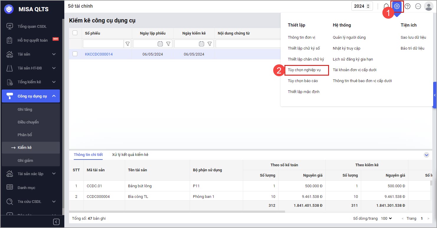 Lưu ý: Nếu có CCDC cần phân bổ thì anh/chị phải thực hiện phân bổ CCDC trước khi kiểm kê CCDC. Chứng từ kiểm kê lên CCDC của tất cả các năm, chứ không lên riêng năm lập chứng từ.