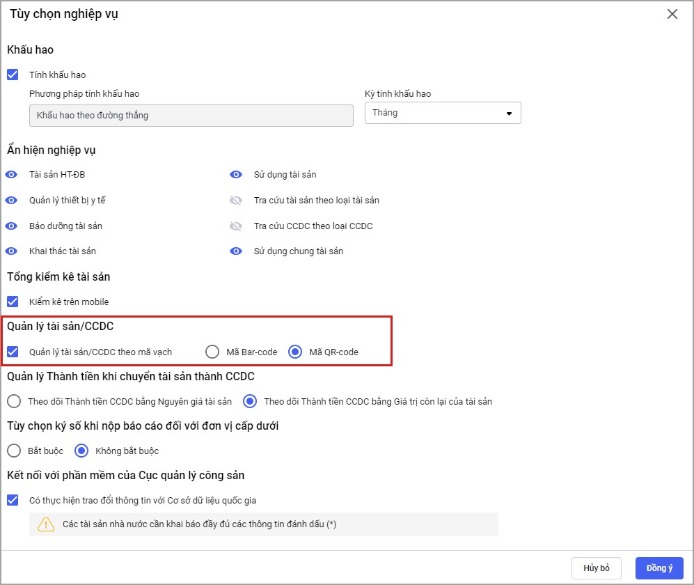 • Tại mục Quản lý tài sản/CCDC, tích chọn Quản lý tài sản/CCDC theo mã vạch. Chọn dạng mã vạch Barcode hoặc QR code. Nhấn Đồng ý.