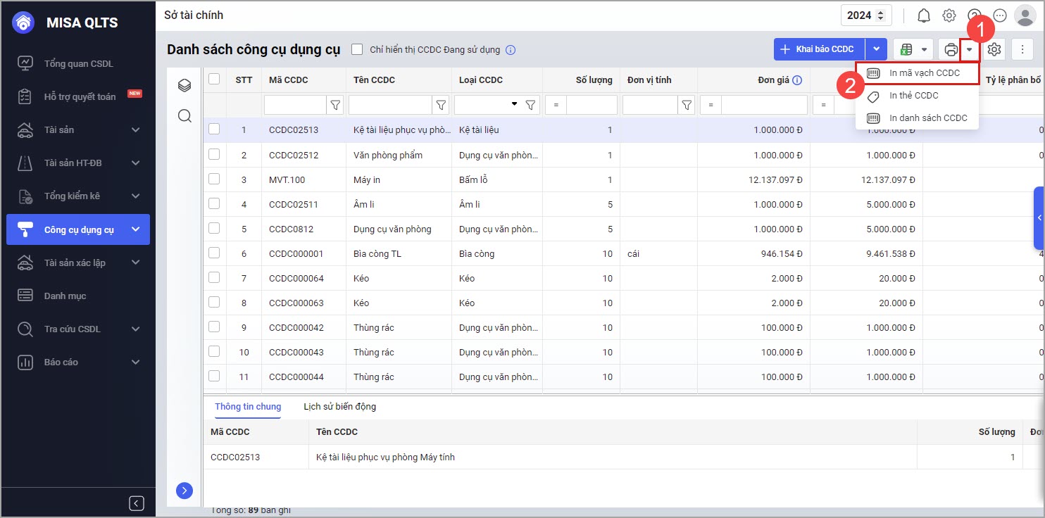 • Tại Công cụ dụng cụ\Danh sách công cụ dụng cụ, nhấn vào biểu tượng máy in, chọn In mã vạch CCDC.