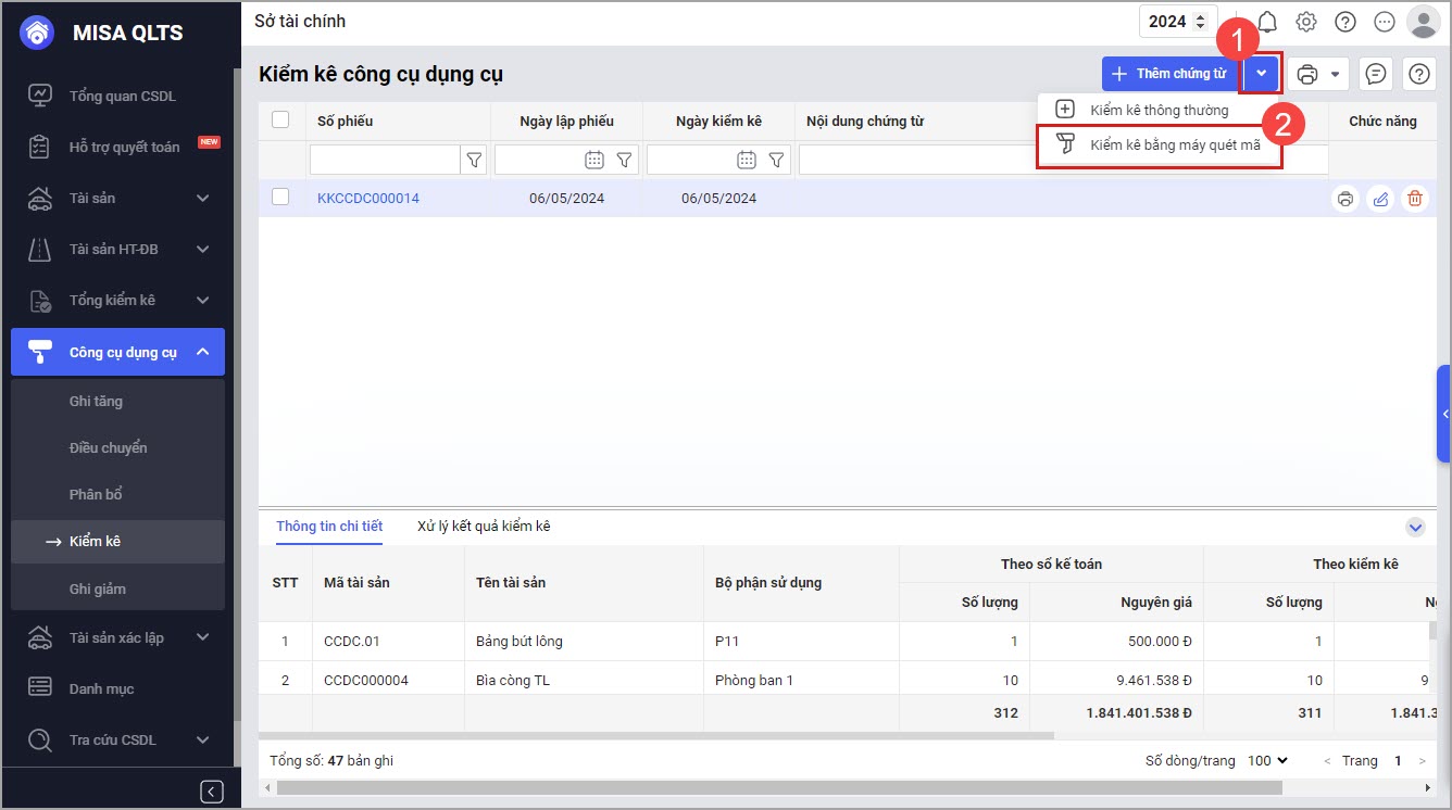 • Vào Công cụ dụng cụ\Kiểm kê, nhấn Lập chứng từ kiểm kê, chọn Kiểm kê bằng máy quét mã.