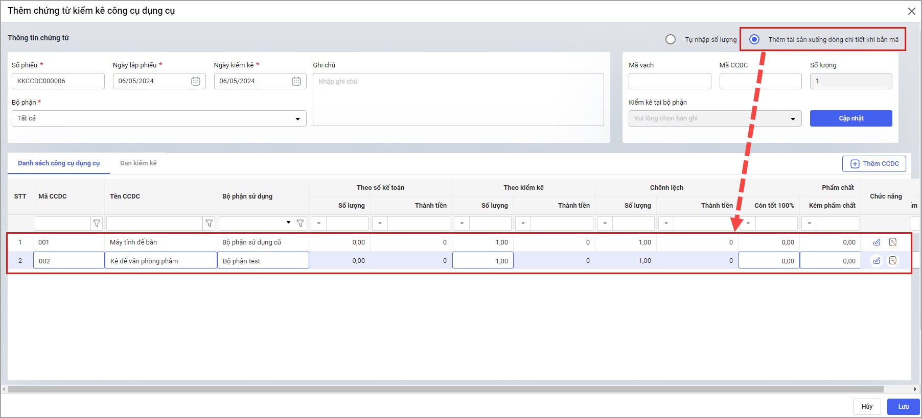 • Nếu chọn Thêm CCDC xuống dòng chi tiết khi bắn mã thì sau khi quét mã, thông tin CCDC sẽ tự động hiển thị ở danh sách CCDC. Mỗi mã CCDC sẽ hiển thị ở 1 dòng riêng.
