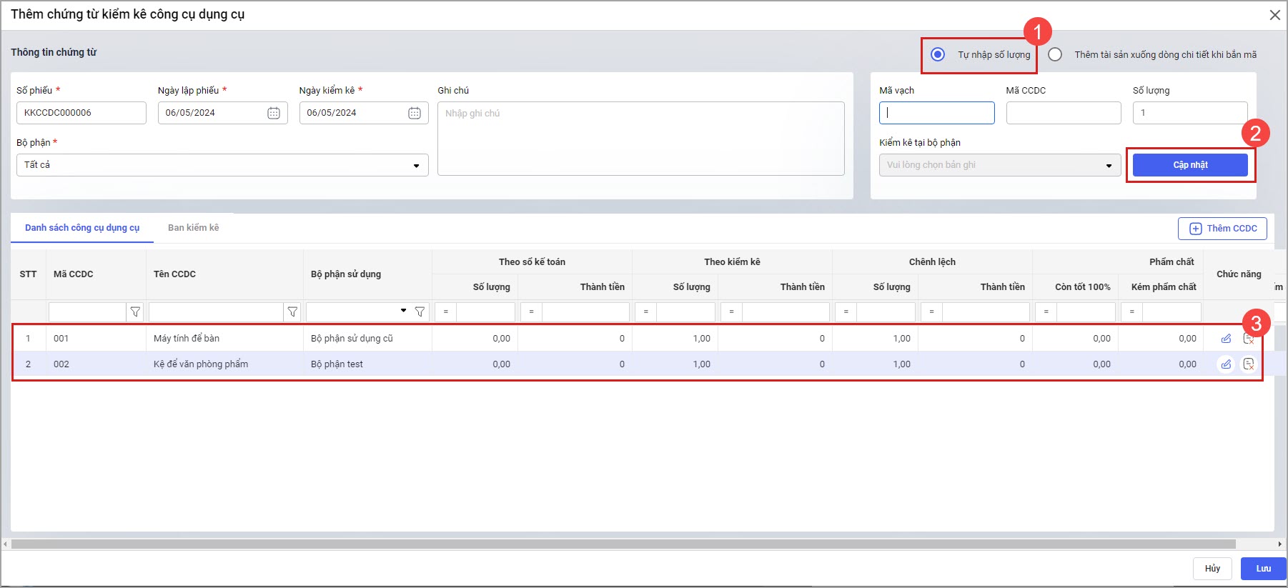 • Nếu chọn Tự nhập số lượng thì sau khi quét mã, anh/chị cần tự nhập tay số lượng CCDC và nhấn Cập nhật để đưa CCDC vào danh sách chi tiết.