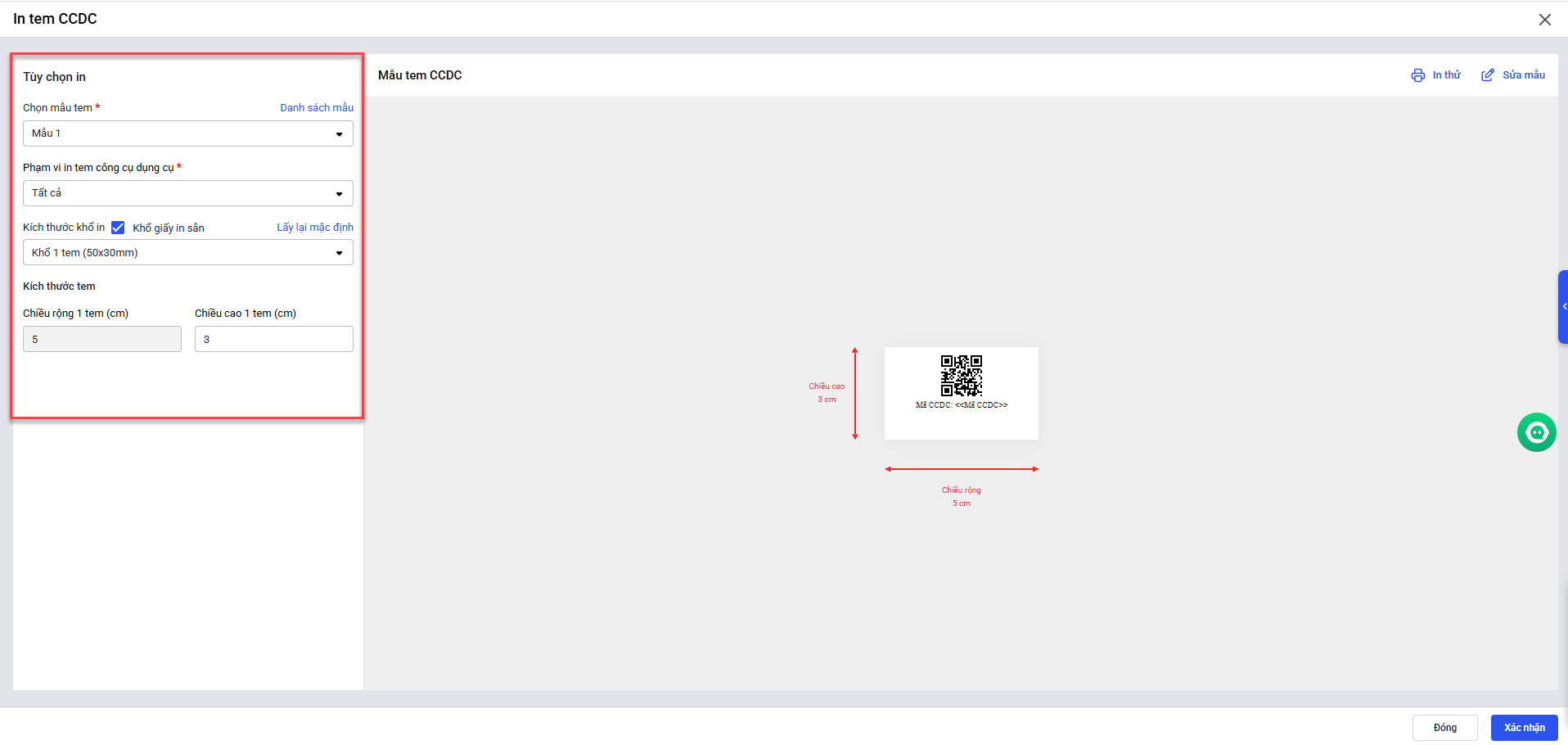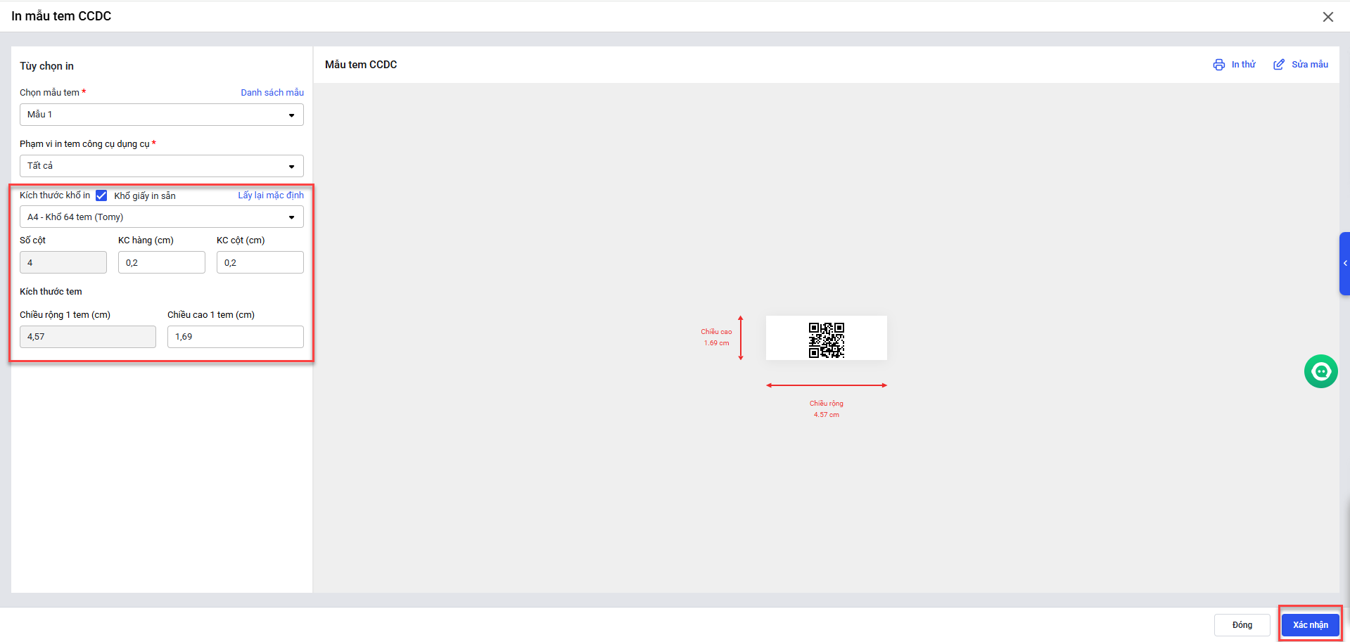 • Anh/chị chỉnh sửa lại kích thước khổ in, số cột, kích thước tem sao cho phù hợp. Sau đó nhấn xác nhận.