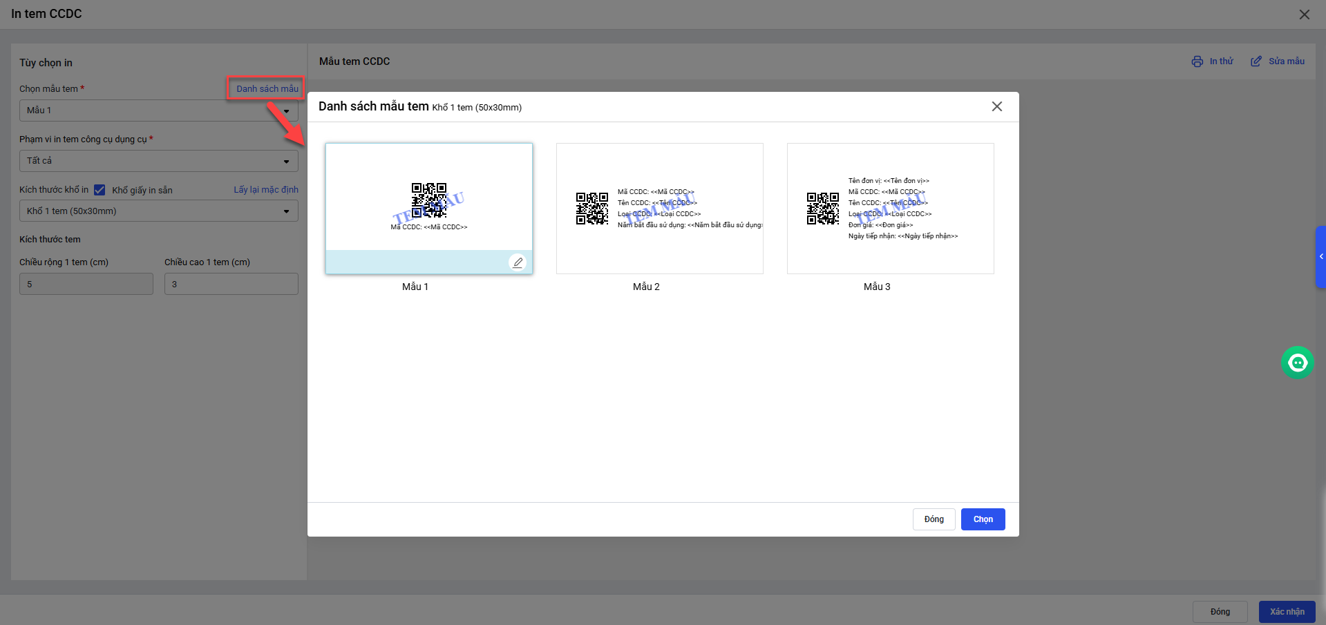 • Tại mục In tem CCDC anh/chị tùy chọn in theo mẫu tem; khổ giấy in; kích thước tem;…