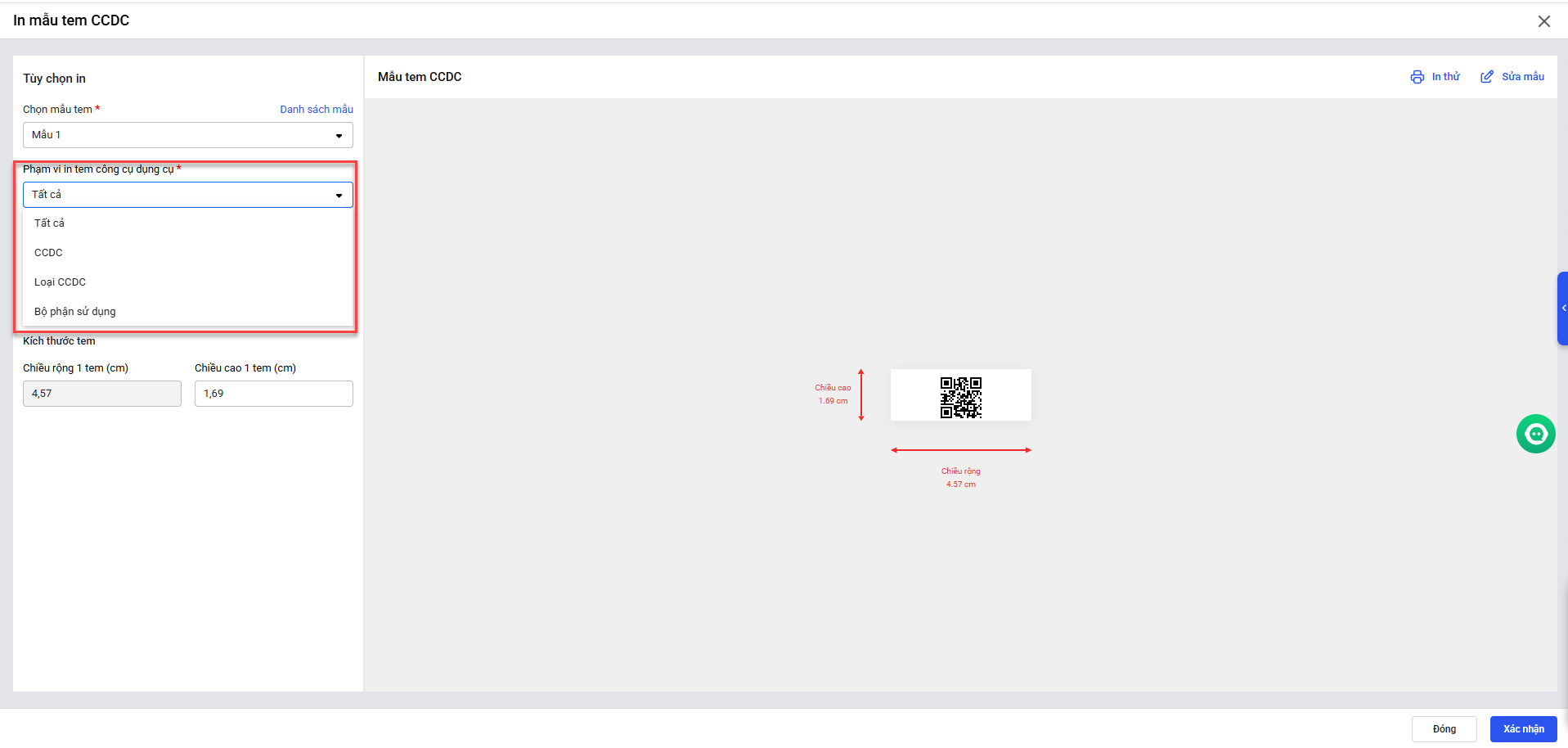• Tại mục Phạm vi in tem công cụ dụng cụ, anh/chị có thể tùy chọn phạm vị in tem: tất cả, chọn từng CCDC, chọn theo loại CCDC hoặc theo bộ phận sử dụng.