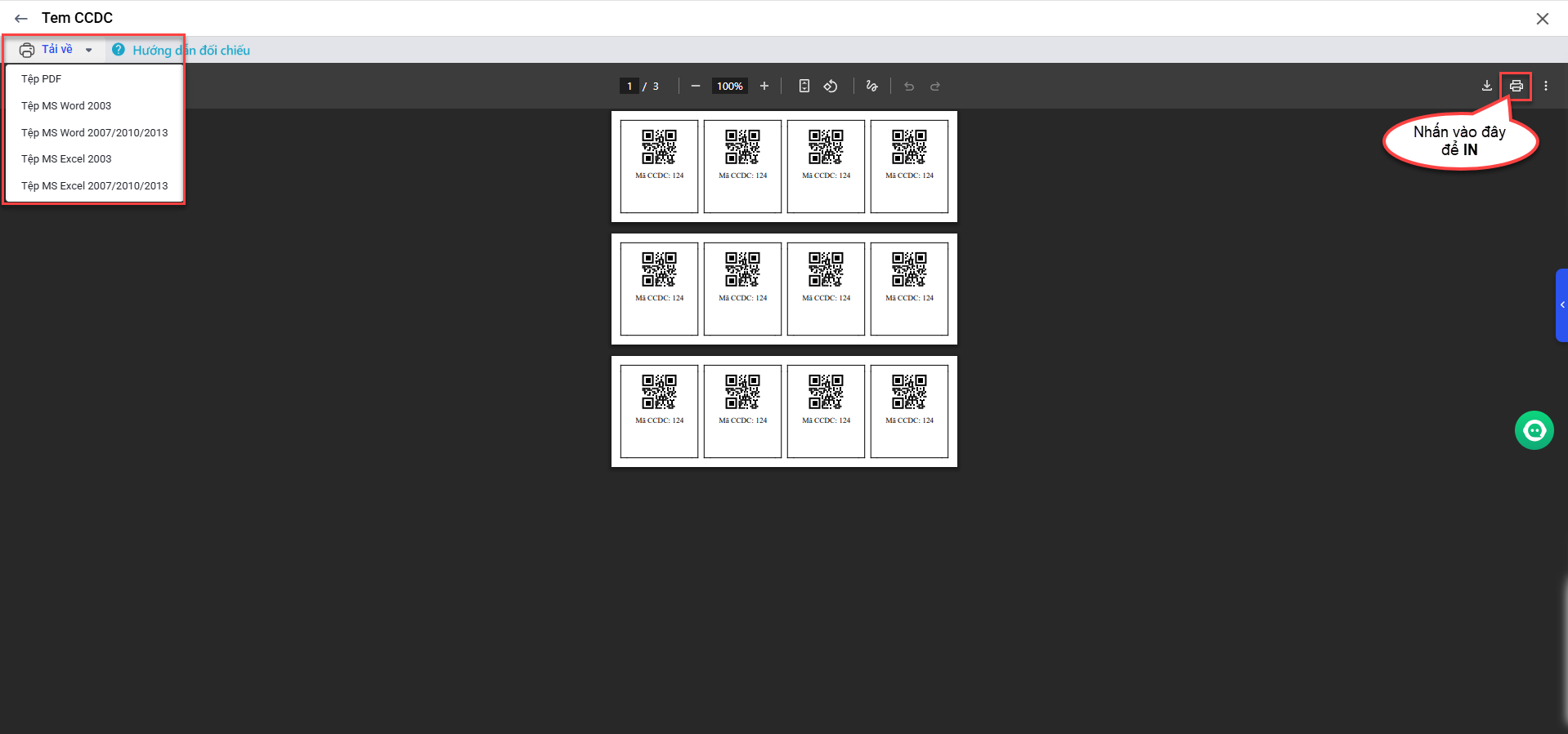 • Chọn Tải về để tải tem về máy dưới nhiều định dạng (PDF, Excel, Word) hoặc in trực tiếp từ phần mềm.