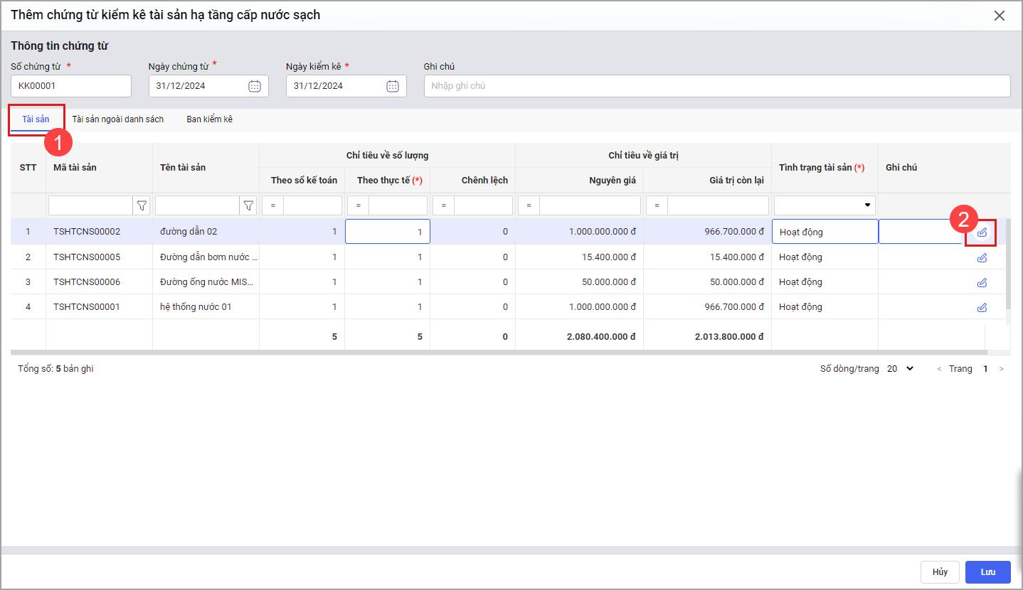 - Nếu có thay đổi về số lượng thực tế của tài sản anh/chị chọn biểu tượng cây bút để nhập lại Số lượng thực tế của tài sản.