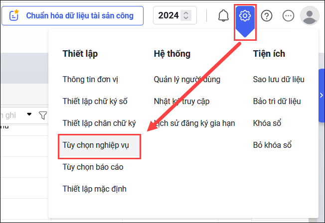 • Vào biểu tượng bánh răng Thiết lập\Tùy chọn Nghiệp vụ.