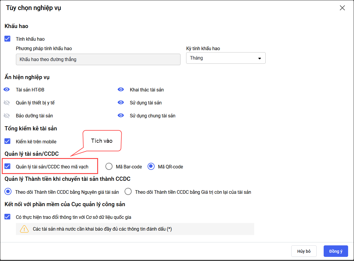 • Tích chọn Quản lý tài sản/CCDC theo mã vạch, chọn dạng mã vạch Barcode hoặc QR code. Nhấn Đồng ý.