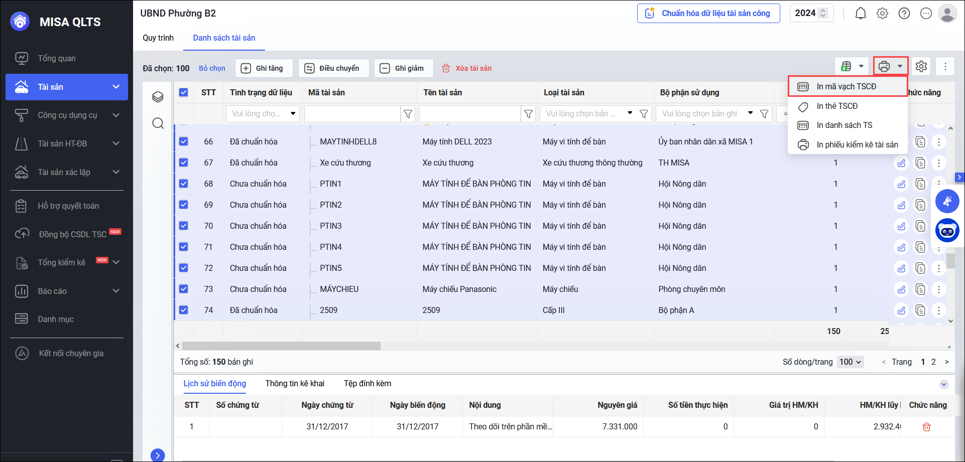 1. Tại màn hình danh sách tài sản, nhấn vào biểu tượng máy in, chọn In mã vạch TSCĐ.